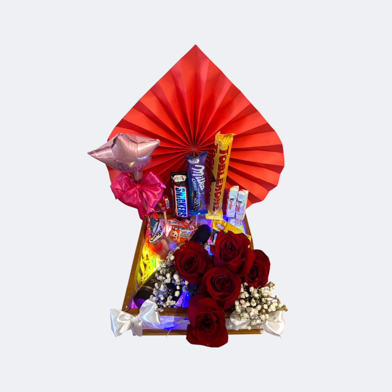 Esta ancheta del tipo celebración es perfecta para un brindis. Contiene una deliciosa champaña o cualquier licor de su preferencia, chocolates al gusto, rosas frescas y decoración personalizable. Tiene un precio de 30€ con IVA incluido.