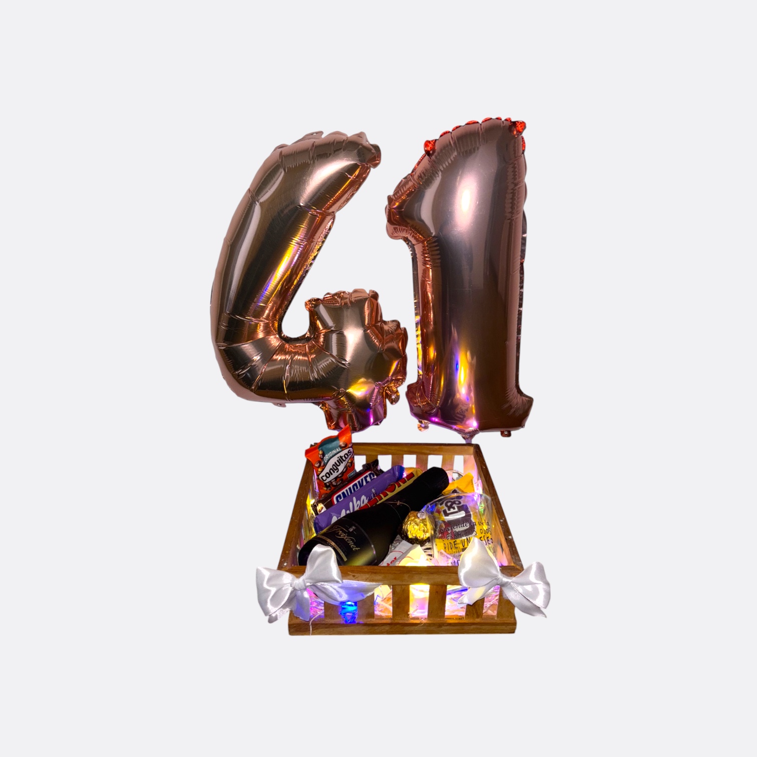 Este obsequio contiene diversos chuches, una mini champaña, globos según la edad cumplida. Un detalle ideal para obsequiar a las personas que mas quieres. Su precio es de 35€ con IVA incluido.