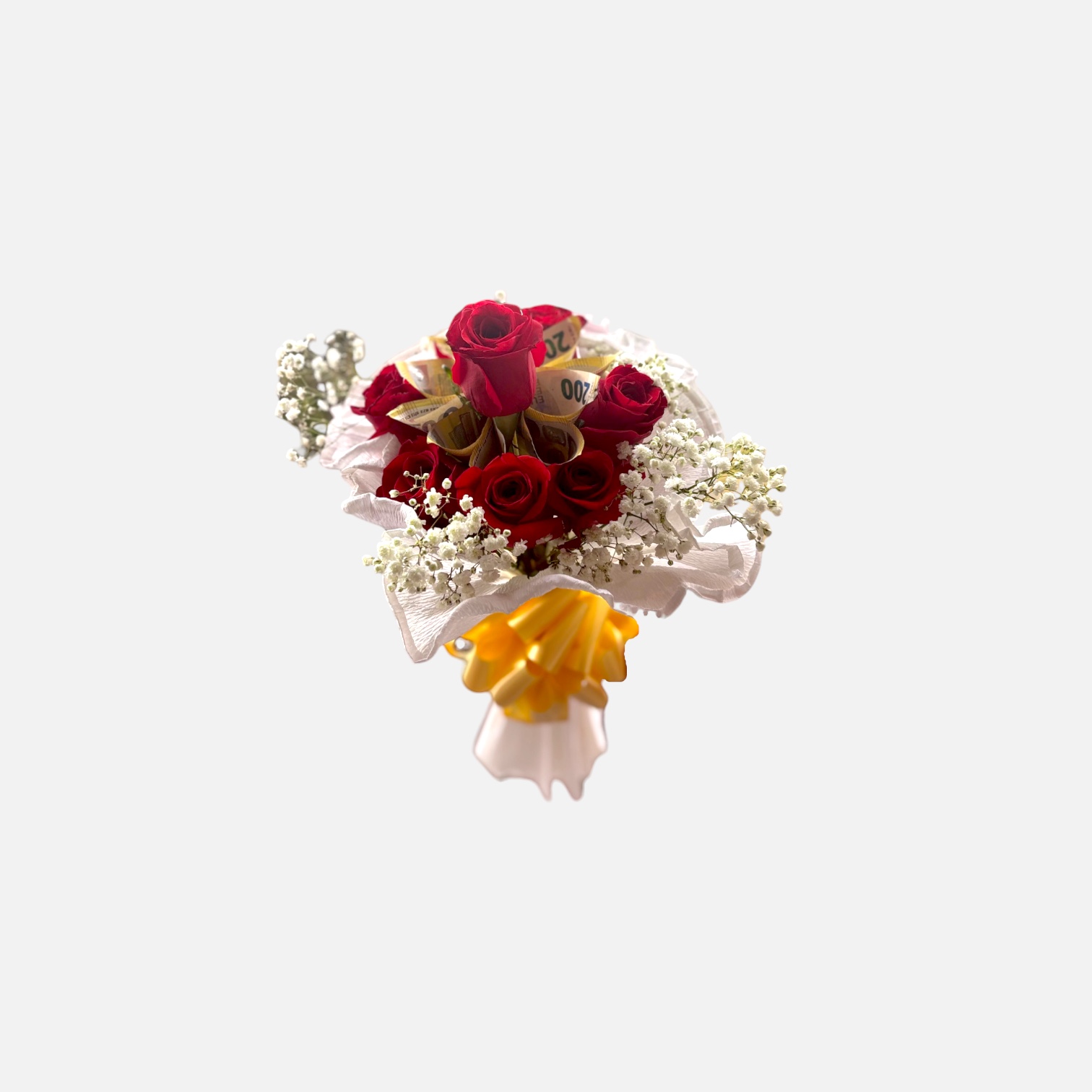 Dentro de nuestros arreglos florales este quizá es el más sorprendente. Elegantes rosas envuelven el lujoso ramo de billetes, el cual es totalmente modificable según el monto a regalar. El costo de este hermoso ramo lujoso es de 1030€ con IVA incluido.